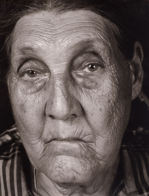 Kizzie, blind from the age of 16 loves being photographed, and when I call and arrange a visit she is always dressed and ready, her sister Martha assists her. I never tell her what to wear or how to pose, sometimes I indicate where she should stand and Martha helps position her or poses with her. She likes to wear glasses and a watch, as she did before her blindness occurred. Listening to my voice, she often decides how to pose. She is an ideal model. Martha describes to Kizzie in detail each Polaroid as we make them and we move, build and create an image together.